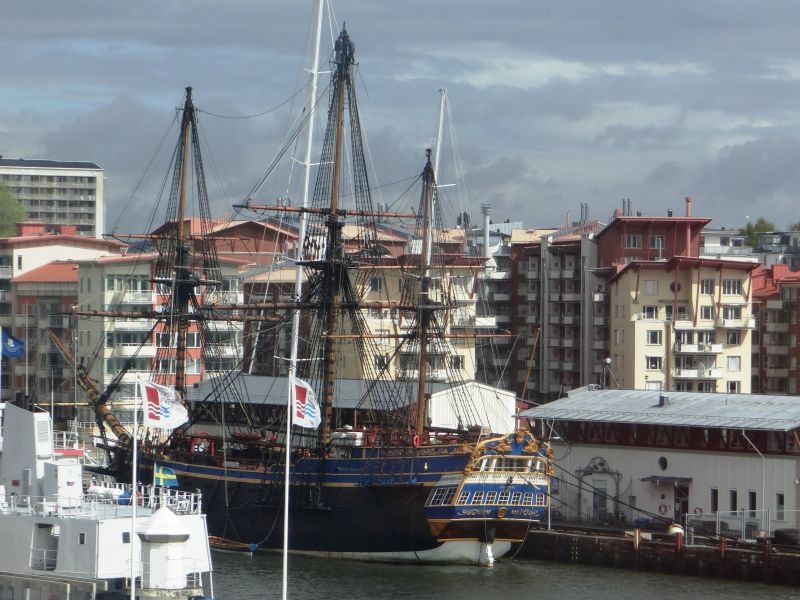 Mooie driemaster in de haven en onderste foto, watertaxi's in de haven van Gotenburg.